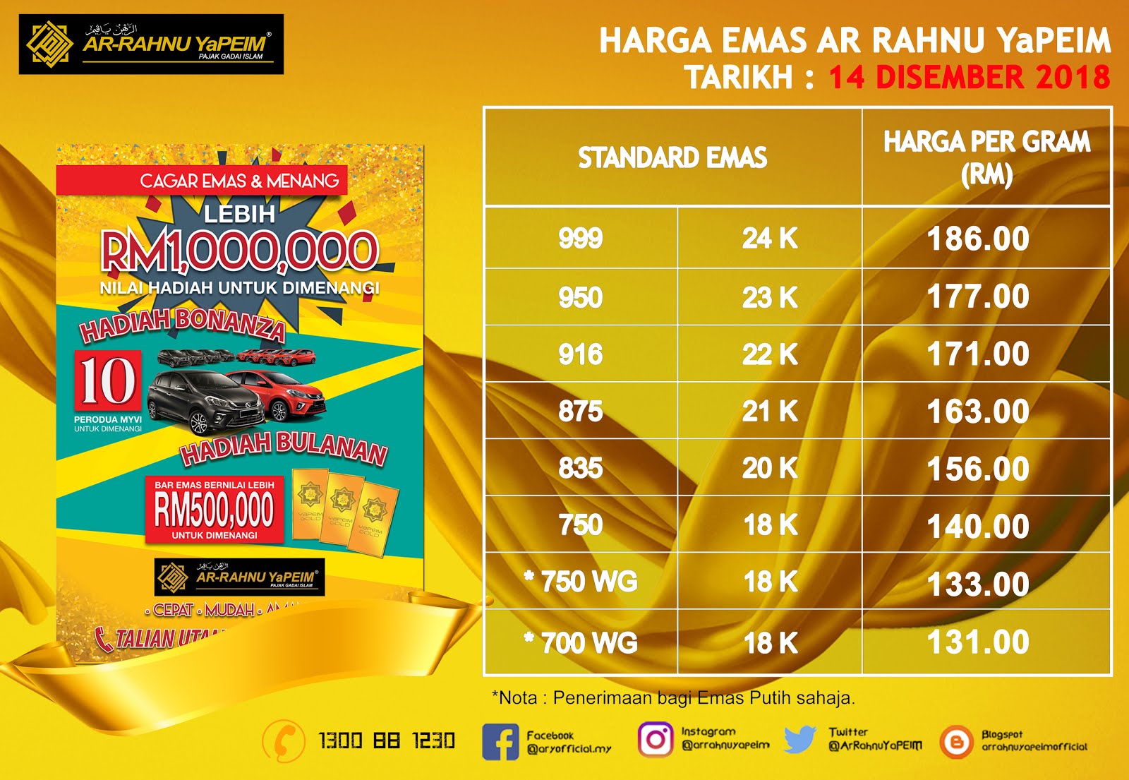 Harga Emas Ar Rahnu Yapeim Pada 14 Disember 2018 Dapatkan Tawaran Tawaran Menarik Dan Perkhidmatan Kami Di Cawangan Ar Rahnu Yapeim Serta Di Perkhidmatan Kaunter Bergerak Yapeim Di Seluruh Malaysia Arrahnuyapeim Cepatmudahamanah Memacukejayaanbersama