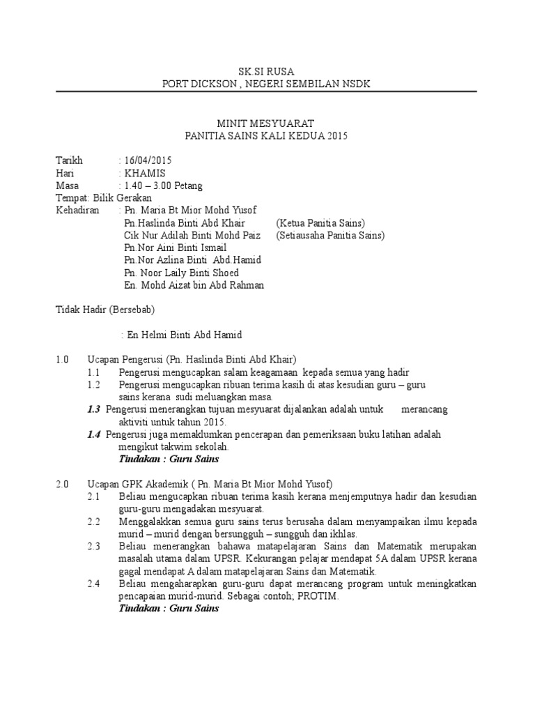 Doc Minit Mesyuarat Panitia Sains Kali Ketiga 2015 Siti Norokiah Academia Edu