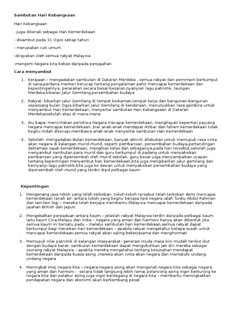 Karangan kepentingan menyambut hari kemerdekaan contoh 1 hari ulang tahun kemerdekaan negara yang kita sambut setiap tahun mempunyai kebaikan dan kepentingannya yang tersendiri kepada kalangan rakyat malaysia. Dan kepentingannya yang tersendiri. Jelaslah di sini bahawa kepentingan menyambut hari kemerdekaan di negara kita adalah untuk mengenang jasa tokoh.