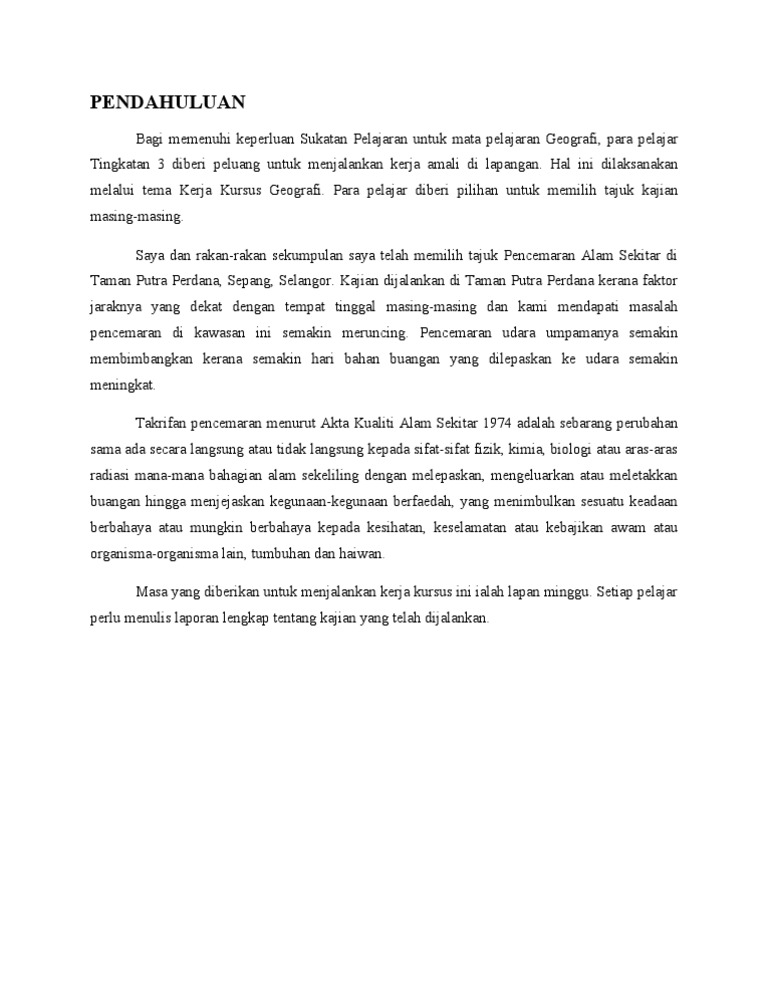 Rujukan tugasan kerja kursus geografi pt3 tahun 2014 pentaksiran tingkatan 3. Takrifan pencemaran yang lebih bermaklumat adalah menurut akta kualiti alam sekitar 1974 yang menyatakan bahawa pencemaran adalah sebarang perubahan sama ada secara langsung atau tidak langsung kepada sifat sifat fizik kimia biologi atau aras aras radiasi mana mana bahagian alam sekeliling dengan melepaskan mengeluarkan atau meletakkan buangan hingga menjejaskan keguanaan kegunaan berfaedah. Bagi memenuhi keperluan penilaian menegah rendah 2011 pelajar pelajar tingkatan 3 diwajibkan menlaksanakan kerja kursus geografi di sekolah.