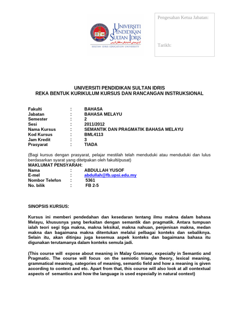 Isi Pelajaran Semantik Dan Peristilhan Bahasa Melayu Psgr Bmm3111 1