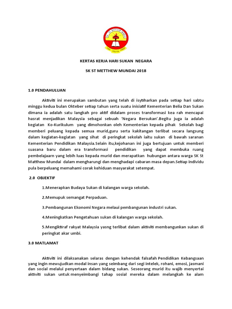 Kertas Kerja Sukan Negara Sk St Matthew Mundai 2018