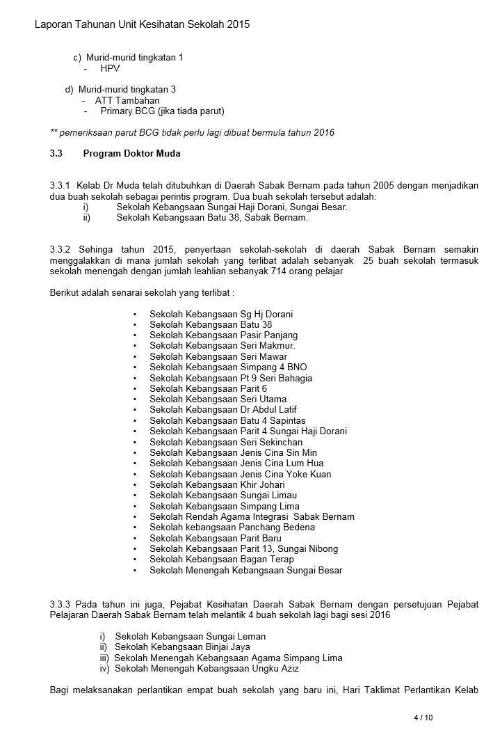 Laporan Tahunan Pejabat Kesihatan Daerah Sabak Bernam Laporan Tahunan 2015 Unit Kesihatan Sekolah Pkd Sabak Bernam
